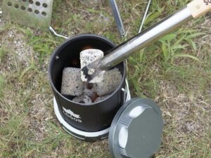 バーベキューコンロを設営して、わくわくしながら炭に火をつける