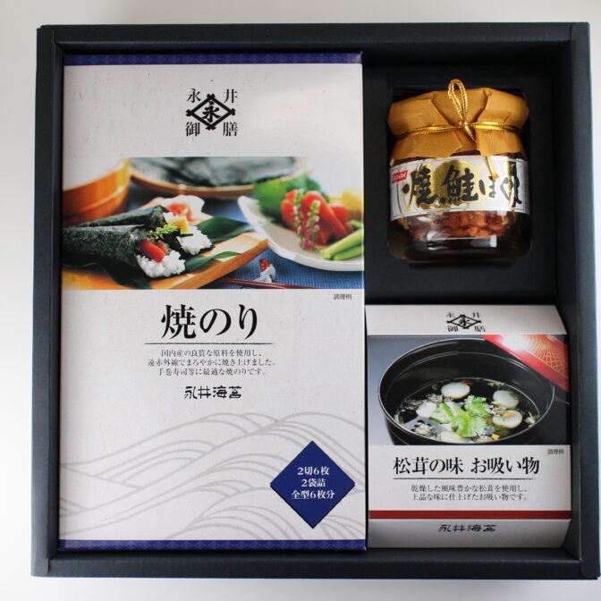 焼き海苔、焼き鮭ほぐし、松茸味のお吸物の詰合せギフト