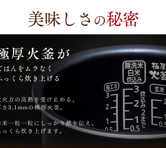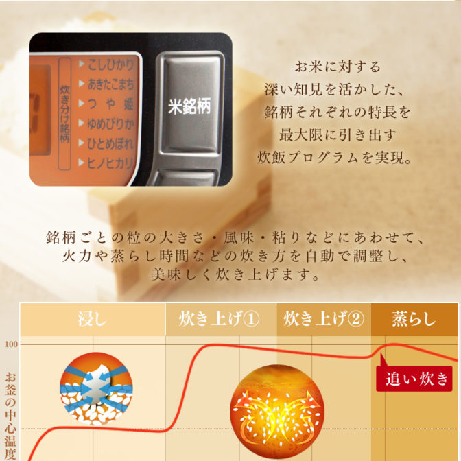 いつものごはんをさらに美味しく炊き上げる、米屋の旨み銘柄炊きジャー炊飯器です。主要な31銘柄を最適な火力と時間で、旨さを引き出し炊き上げます。3.1mmの極厚火釜で鍋全体を一気に加熱し、炊きむらの少ない炊飯が可能です。底+蓋ヒーターで釜全体を加熱し、吹きこぼれ・保温性能の不満を改善しました。炊飯メニューが6メニュー(無洗米・白米・炊込み・おかゆ・玄米・煮込/蒸し)と3つのモード(炊き分け銘柄・省エネ・早炊き)があります。タイマーを使って炊き上がり時刻を予約することができます。