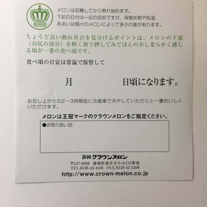 fruits静岡マスクメロン(クラウン)1玉 限定4~6月 9月~11月 通常価格6000 円 (税込) sold out ※商品の他に送料が発生します。説明静岡マスクメロン(クラウン)1玉期間限定販売 4~6月 9月~11月 王冠マークの高級マスクメロン=クラウンメロンです。 デパートや高級フルーツ専門店では、桐箱に入って、8,000 円から 14,000 円くらいで販売されている、まさに高級ギフトの定番。コメントは受け付けていません。